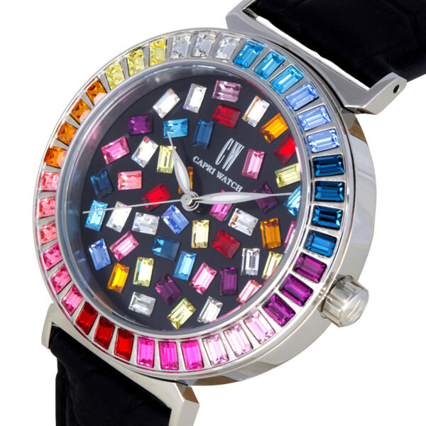 La ghiera in acciaio è impreziosita da una selezione di baguette Swarovski multicolore. La cassa e il cinturino in pelle nera completano il look con un tocco classico e sofisticato. - 380,00 €