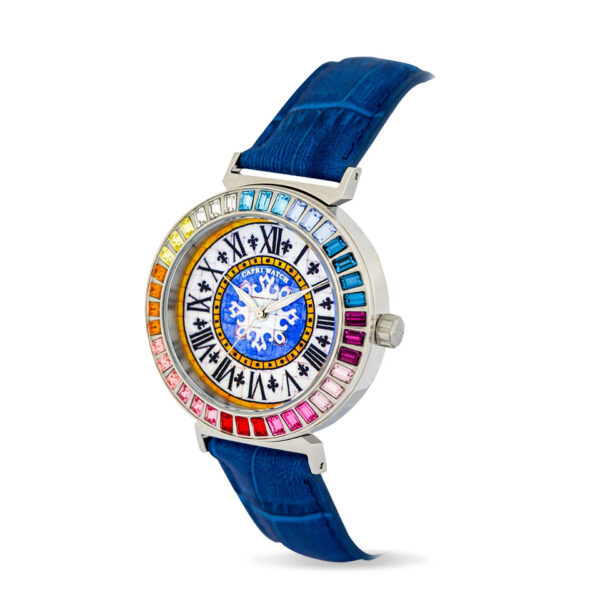 La ghiera è impreziosita da cristalli Swarovski colorati in taglio baguette, che donano luce e raffinatezza. Il cinturino in pelle Blu Royal aggiunge un tocco di classe in più. - 390,00 €