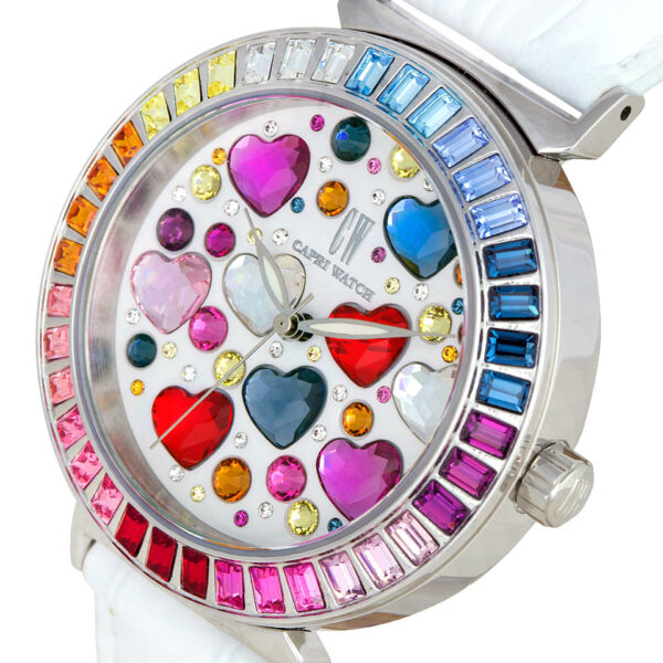 Un inno all’amore romantico, questo è il Rossella LoveJoy Silver. Il suo quadrante bianco impreziosito da cristalli Swarovski colorati a forma di cuori, la cassa in acciaio completata da una splendida ghiera decorata con baguettes Swarovski multicolore lo rendono un orologio brillante e iper-femminile.
