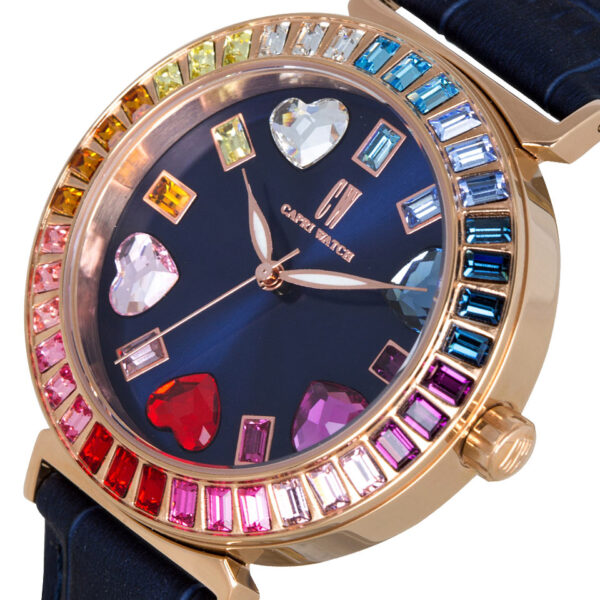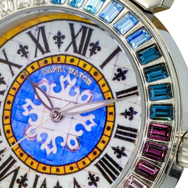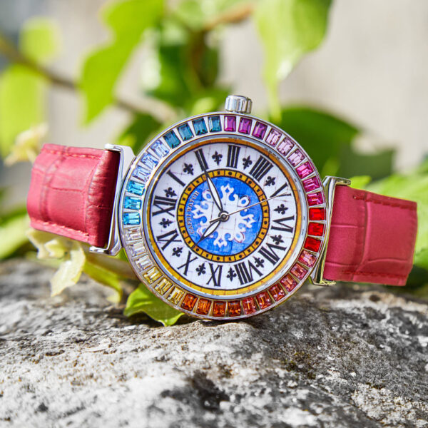 L’Orologio Rossella First è un vero e proprio gioiello che rende omaggio al celebre orologio del campanile della Piazzetta di Capri, grazie al quadrante che riproduce il design iconico dell’isola, simbolo senza tempo di eleganza e tradizione. La ghiera è arricchita da cristalli Swarovski colorati in pregiato taglio baguette, per un tocco di luce e raffinatezza.