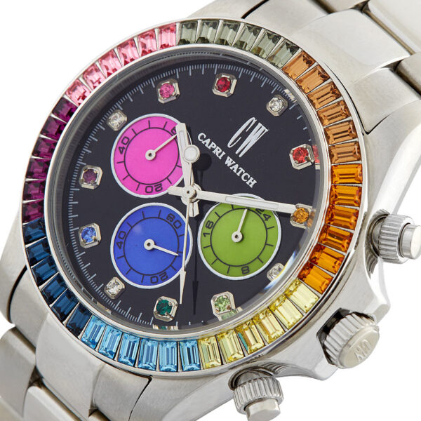 Il Cronografo Rossella è un’esplosione di luce e colore, pensato per chi ama distinguersi con eleganza. Il quadrante bianco è valorizzato da contatori crono multicolore e indici luminosi, mentre la ghiera è impreziosita da baguette in cristalli Swarovski colorati, per un effetto brillante e sofisticato.