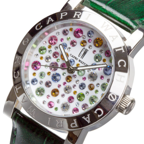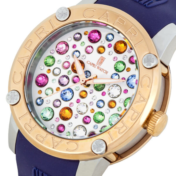 L’Orologio Rossella First è un vero e proprio gioiello che rende omaggio al celebre orologio del campanile della Piazzetta di Capri, grazie al quadrante che riproduce il design iconico dell’isola, simbolo senza tempo di eleganza e tradizione. La ghiera è arricchita da cristalli Swarovski colorati in pregiato taglio baguette, per un tocco di luce e raffinatezza.
