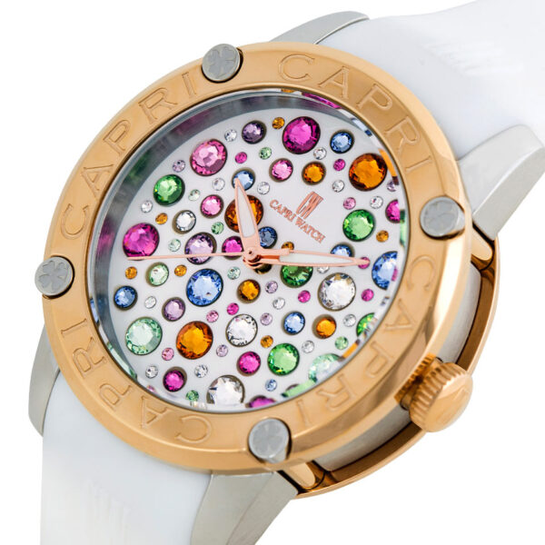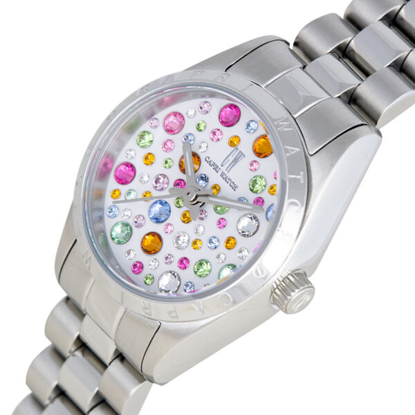 Il Paola Multijoy è un orologio femminile ricco di stile. Ha un quadrante bianco decorato con cristalli Swarovski multicolore che riflettono la luce con un effetto gioiello sorprendente.