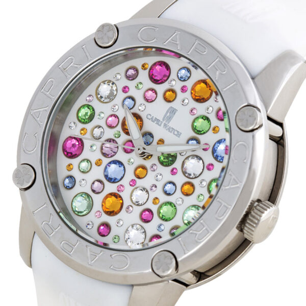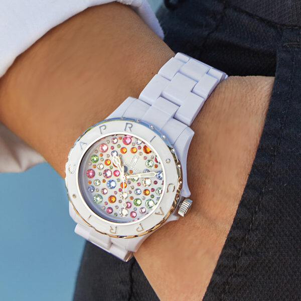 Orologio dal design luminoso e raffinato. Il quadrante bianco, impreziosito da cristalli Swarovski di vari colori e dimensioni, cattura la luce con un effetto brillante. La ghiera incornicia con armonia il quadrante, aggiungendo un tocco di eleganza. La cassa e il cinturino a maglie, entrambi in policarbonato bianco esaltano l’equilibrio perfetto tra stile e modernità. Un accessorio che combina fascino e personalità in ogni dettaglio.