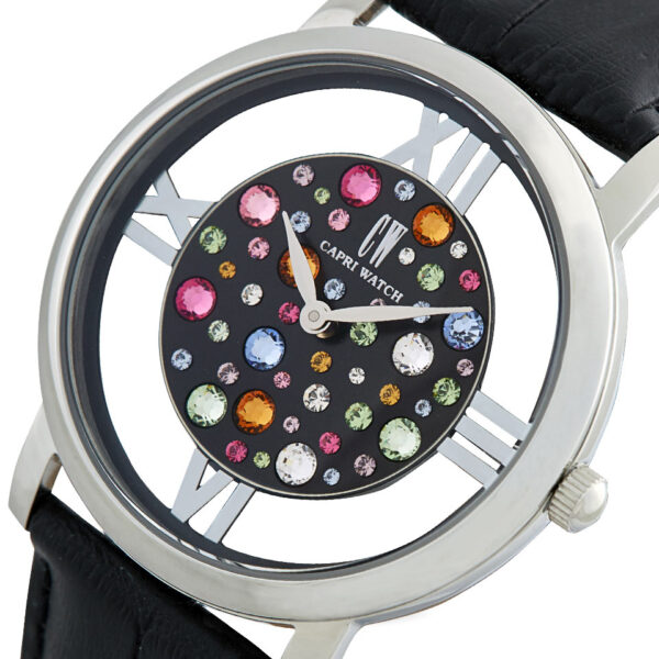 L’Orologio Multijoy Light combina innovazione e raffinatezza con un design moderno. Il quadrante trasparente su fondo nero è arricchito da eleganti dettagli in acciaio e scintillanti cristalli Swarovski, per un effetto luminoso e contemporaneo. La cassa in acciaio presenta uno stile “light”, il cinturino in pelle nero aggiunge una perfetta indossabilità.