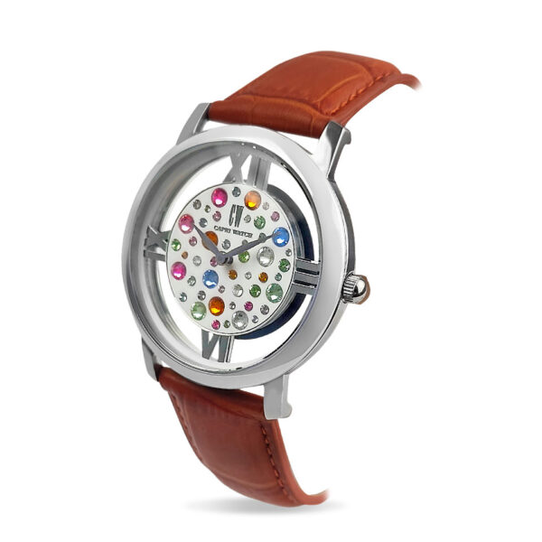 Il modello Multijoy Light combina un quadrante trasparente con elementi in acciaio e cristalli Swarovski, offrendo estetica e funzionalità in un’unica soluzione. Il fondo bianco del quadrante esalta la brillantezza dei dettagli, mentre la cassa in acciaio dona equilibrio e personalità al design. Il tutto è completato da un elegante cinturino in pelle arancione, ideale per chi desidera un tocco di colore raffinato.