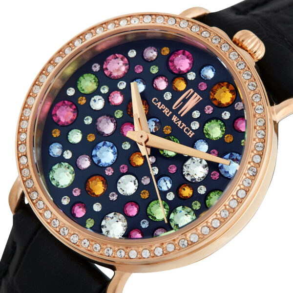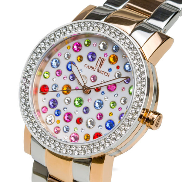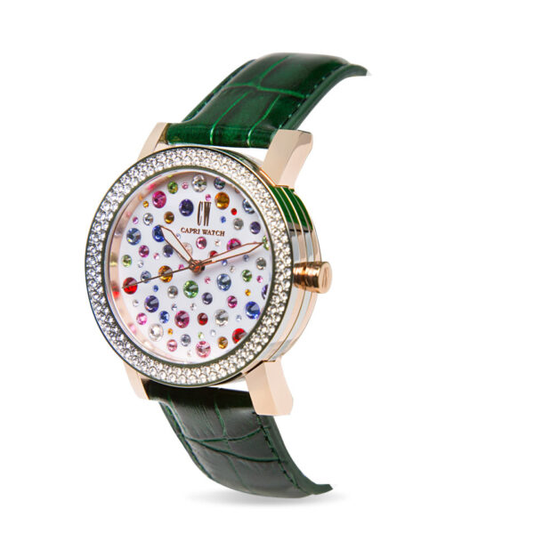 Scopri l’Orologio Capri Watch Multijoy Classic Green, un modello che unisce design raffinato e materiali di alta qualità. Questo orologio da polso da donna è caratterizzato da una cassa in acciaio bimetal, acciaio e oro rosa, impreziosita da cristalli Swarovski bianchi e un quadrante bianco decorato con cristalli Swarovski multicolore, per un effetto gioiello sorprendente.