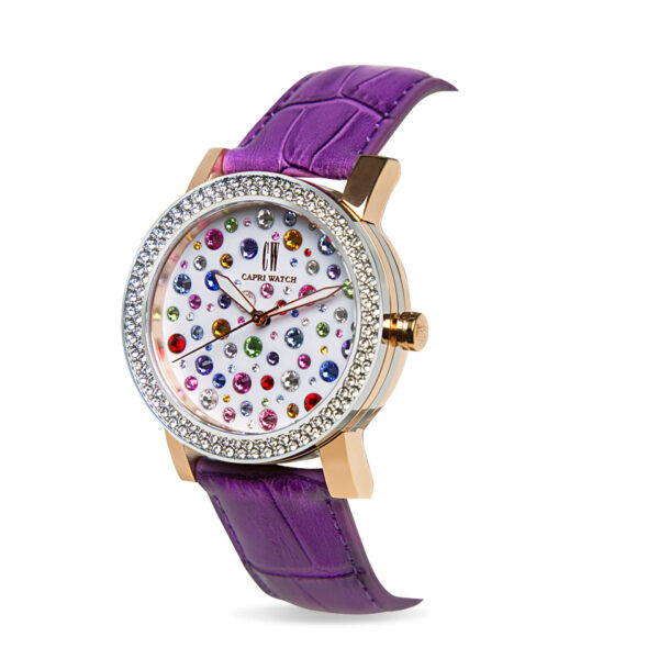 L’Orologio MultiJoy Classic Purple con quadrante bianco e cinturino viola in pelle è un capolavoro di brio ed eleganza. Il quadrante è arricchito da cristalli di vari colori e dimensioni, che riflettono la luce creando un effetto sofisticato. La ghiera impreziosita da cristalli bianchi aggiunge un tocco di classe, mentre la cassa bimetal unisce materiali di alta qualità per una maggiore resistenza e uno stile distintivo. Perfetto per aggiungere un accento di colore al tuo look.