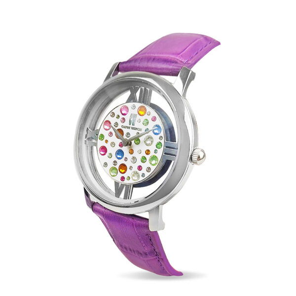 Esalta il tuo stile con l’orologio da donna Multijoy Light. Il quadrante trasparente con dettagli in acciaio lucido e cristalli Swarovski incastonati brilla su un elegante fondo bianco. La cassa in acciaio abbinata a un sofisticato cinturino viola in vera pelle, dona un tocco di colore originale.