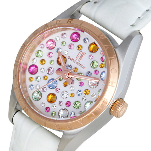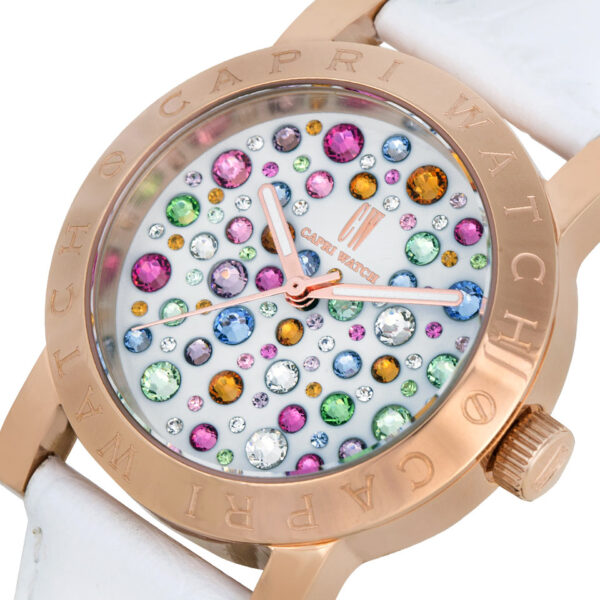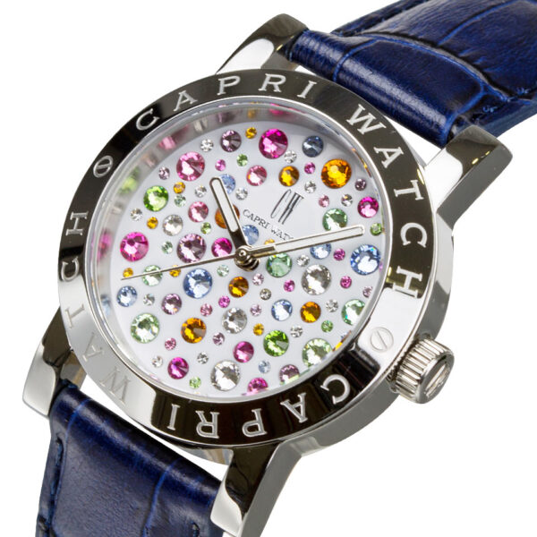 L’Orologio Rossella First è un vero e proprio gioiello che rende omaggio al celebre orologio del campanile della Piazzetta di Capri, grazie al quadrante che riproduce il design iconico dell’isola, simbolo senza tempo di eleganza e tradizione. La ghiera è arricchita da cristalli Swarovski colorati in pregiato taglio baguette, per un tocco di luce e raffinatezza.