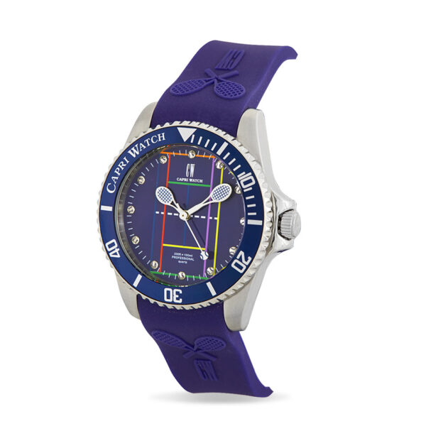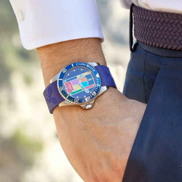 L’Orologio Capri Watch Tennis è l’ accessorio perfetto per lo sportivo. La cassa in acciaio e la ghiera blu conferiscono un aspetto moderno e dinamico, mentre il quadrante blu presenta un design unico con un patch colorato che richiama un campo da tennis. Ideale per l’uso quotidiano e le attività sportive.