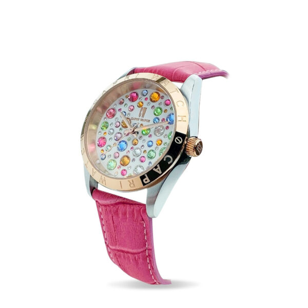 L’Orologio Multijoy è un perfetto connubio di eleganza e brillantezza. Il quadrante bianco, arricchito da cristalli Swarovski di varie dimensioni e colori, cattura la luce ad ogni movimento, creando un effetto scintillante che non passa inosservato. Perfetto per chi cerca un orologio che unisca stile, lusso e versatilità.