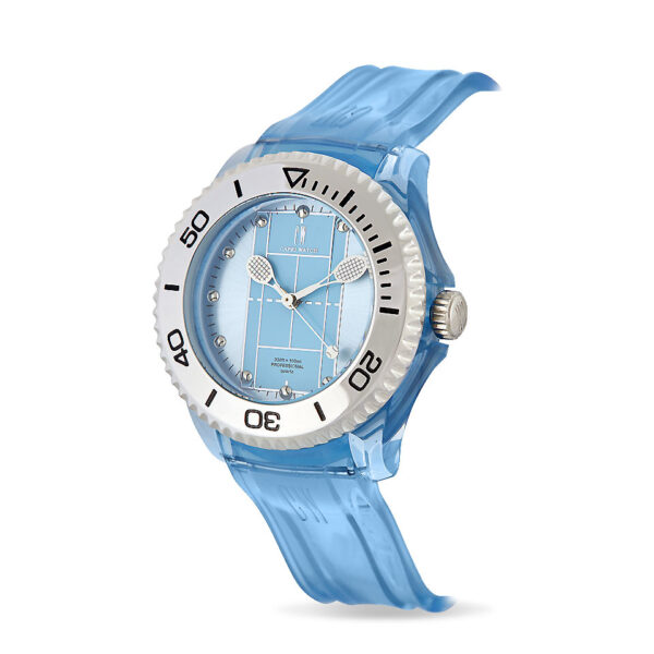 Scopri l’Orologio celeste con quadrante dal design unico che riproduce un campo da tennis, arricchito da linee in acciaio eleganti e dettagli sportivi. Le lancette, a forma di racchette da tennis, donano un tocco originale e dinamico. La ghiera numerata e la cassa in policarbonato trasparente combinano resistenza e stile moderno. Il cinturino in silicone celeste trasparente garantisce comfort e una vestibilità leggera, perfetta per chi ama un look sportivo e allegro.