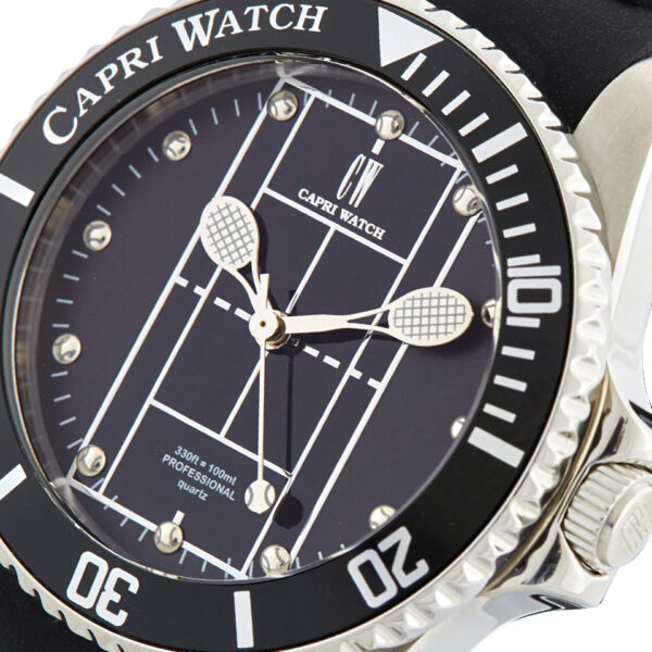 L’Orologio Tennis – variante nera – unisce stile sportivo e design creativo in un accessorio unico e riconoscibile. Il quadrante nero raffigura un campo da tennis stilizzato, impreziosito da linee color acciaio che definiscono con eleganza ogni dettaglio. Le lancette in acciaio a forma di racchette da tennis ne completano il design.