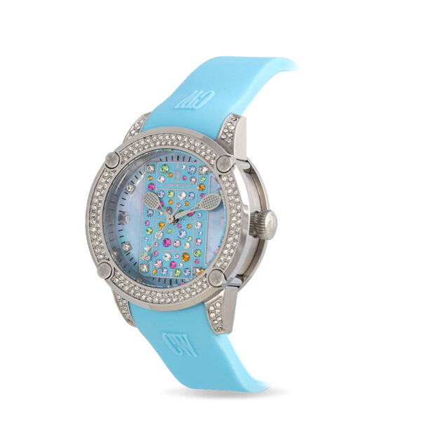 Orologio Tennis Lady MultiJoy, un connubio perfetto tra eleganza e passione per lo sport. Il suo quadrante celeste in madreperla si distingue per il raffinato design che richiama il campo da tennis, arricchito da cristalli Swarovski colorati. Le lancette a forma di racchette aggiungono un tocco di originalità, mentre la ghiera incornicia il quadrante con ulteriori cristalli Swarovski.