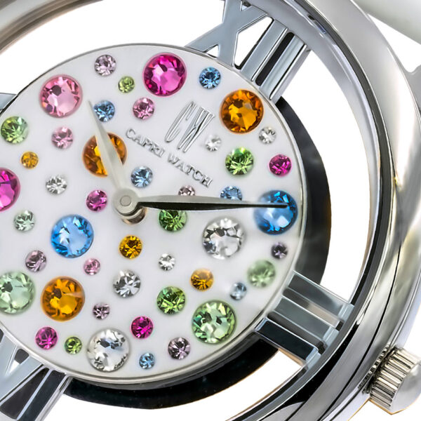 Scopri l’Orologio Capri Watch MultiJoy Classic Orange, un accessorio che unisce stile, colore e raffinatezza. Parte della celebre collezione MultiJoy, questo orologio da donna è caratterizzato da un quadrante bianco impreziosito da cristalli Swarovski di vari colori e dimensioni, che catturano la luce con eleganza. La ghiera in acciaio, arricchita da cristalli bianchi, e la cassa bimetal in acciaio e oro rosa conferiscono un tocco di lusso al design. Il cinturino in pelle arancione aggiunge un accento di colore vivace, rendendo questo orologio perfetto per ogni occasione.