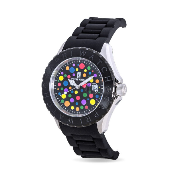 Sub Circles Black è un orologio che unisce originalità e praticità. Presenta un elegante quadrante nero arricchito da sfere colorate che aggiungono un tocco di brio. La ghiera di colore nero crea un contrasto elegante con la cassa in acciaio.