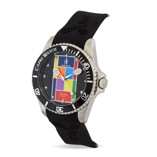 Porta un tocco di colore e originalità al tuo polso con questo Orologio Tennis dal quadrante nero decorato con un vivace design del campo da tennis. La ghiera numerata aggiunge funzionalità e stile sportivo. La cassa in acciaio, il cinturino nero in silicone rendono questo accessorio ideale per chi ama un look dinamico e versatile.