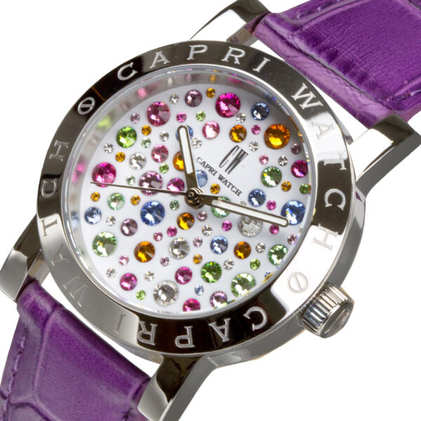 Paola Multijoy, un orologio dal design semplice ed elegante e dal colore vivace. Il quadrante MultiJoy, luminoso e colorato contrasta con la sobrietà della ghiera e della cassa interamente in acciaio che ne garantiscono resistenza e praticità, il cinturino viola in pelle aggiunge un ulteriore tocco di colore vivace che richiama il quadrante.