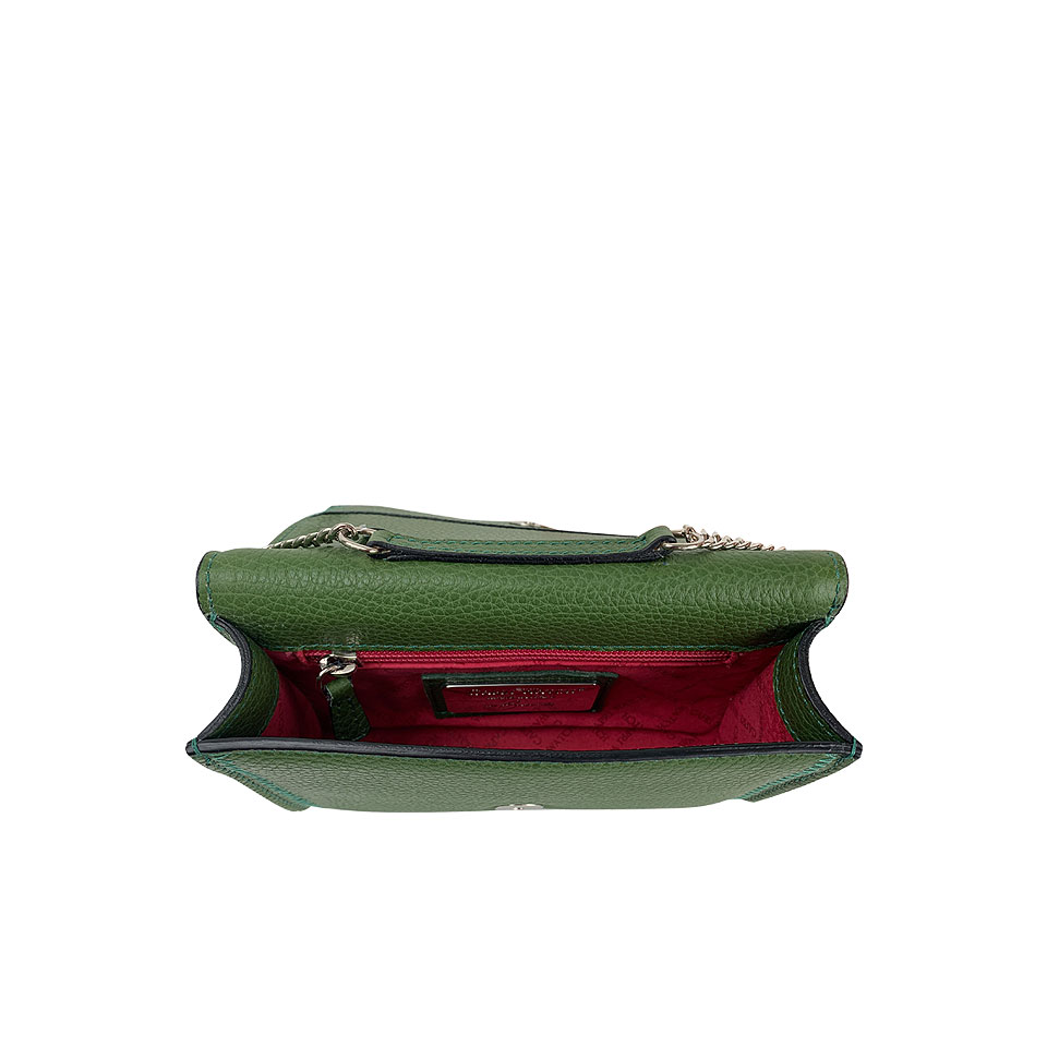 La tracolla a catena in metallo color acciaio aggiunge un dettaglio moderno e raffinato, permettendo di indossarla comodamente a spalla o crossbody. Grazie alle sue dimensioni contenute e alla leggerezza, si adatta alle giornate più dinamiche, trasformandosi all’occorrenza in una mini clutch chic per le occasioni serali o gli eventi speciali.