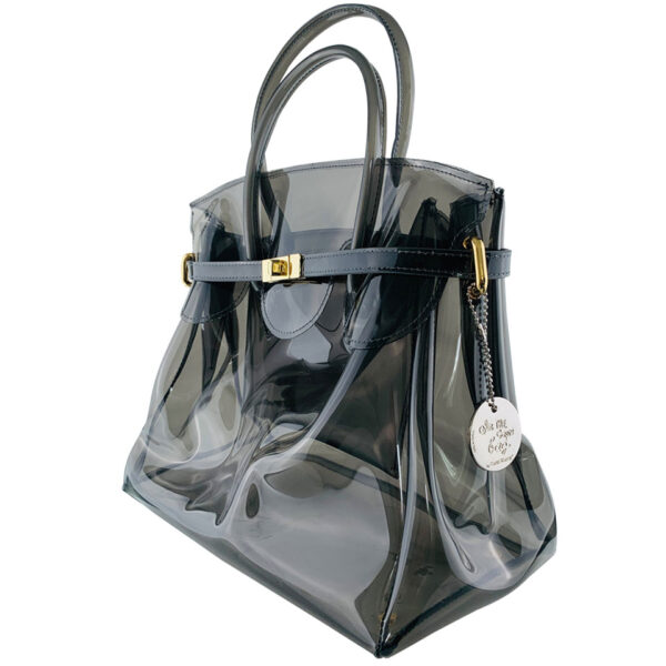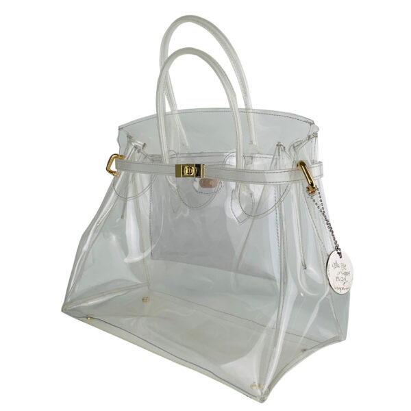 Il design trasparente lascia intravedere ciò che contiene, mentre la chiusura dorata aggiunge un tocco chic che bilancia il suo spirito ironico e contemporaneo.
