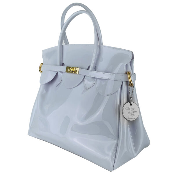 Il bianco brillante con riflesso glossy illumina ogni outfit, mentre la chiusura dorata aggiunge quel dettaglio prezioso che fa subito “wow”.