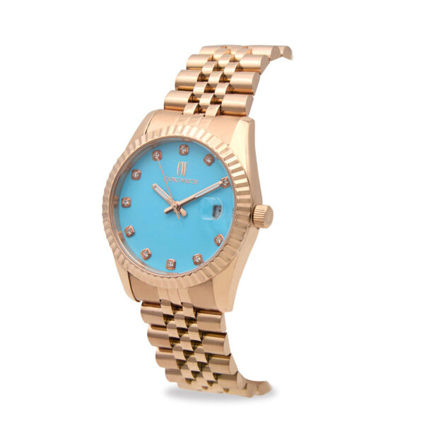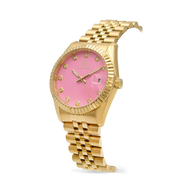 Il bracciale in acciaio oro rosa offre comfort e robustezza, rendendo questo orologio ideale per l’uso quotidiano e per le occasioni speciali.