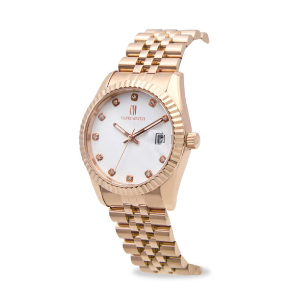 La cassa e il bracciale in acciaio oro rosa garantiscono resistenza, comfort e un’eleganza senza tempo. Questo orologio è perfetto sia per l’uso quotidiano che per le occasioni speciali.