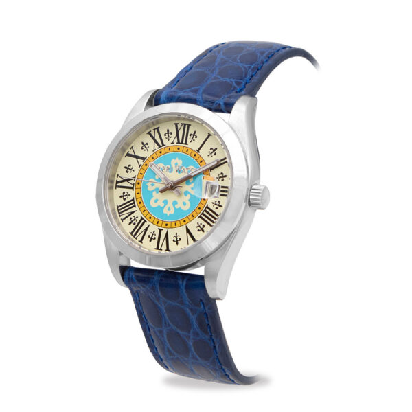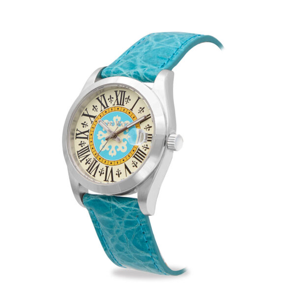 Il cinturino in coccodrillo blu chiaro, delicato e avvolgente, accarezza il polso con stile e comfort, mentre la cassa in acciaio e il datario a ore 3 combinano praticità e charme.