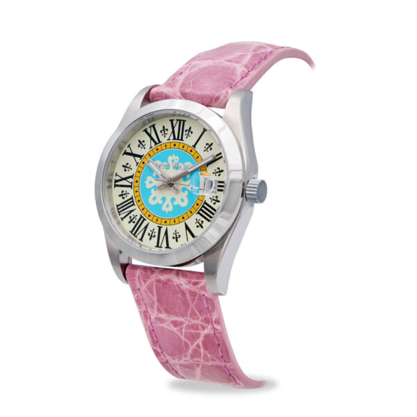 Gli indici decorati con cristalli Swarovski aggiungono un tocco di brillantezza, mentre la finestra datario a ore 3, dotata di ingrandimento, garantisce praticità e leggibilità.