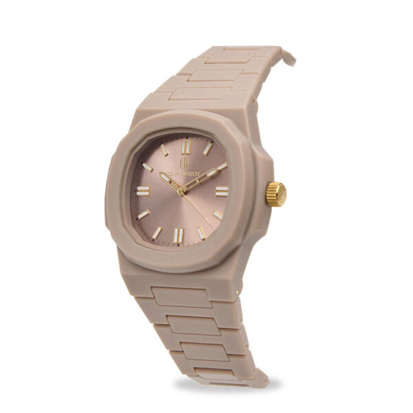 Il quadrante beige con indici bianchi in rilievo garantisce una lettura chiara e immediata, mentre il materiale leggero e resistente lo rende perfetto da indossare tutti i giorni.