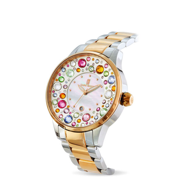 L’Orologio MultiJoy Classic Bimetal è pensato per chi ama gli accessori che uniscono eleganza e preziosità. Il quadrante bianco, adornato con cristalli Swarovski di varie dimensioni e colori, cattura la luce in modo delicato, creando un effetto molto luminoso.