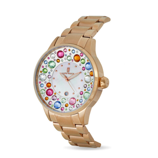 L’Orologio Millefiori unisce eleganza e colore grazie al suo raffinato quadrante in madreperla con datario, incorniciato da cristalli Swarovski colorati che donano brillantezza e vivacità al design. La ghiera in acciaio placcato oro rosa aggiunge un tocco di lusso e femminilità, mentre la cassa in acciaio garantisce resistenza e durata.
